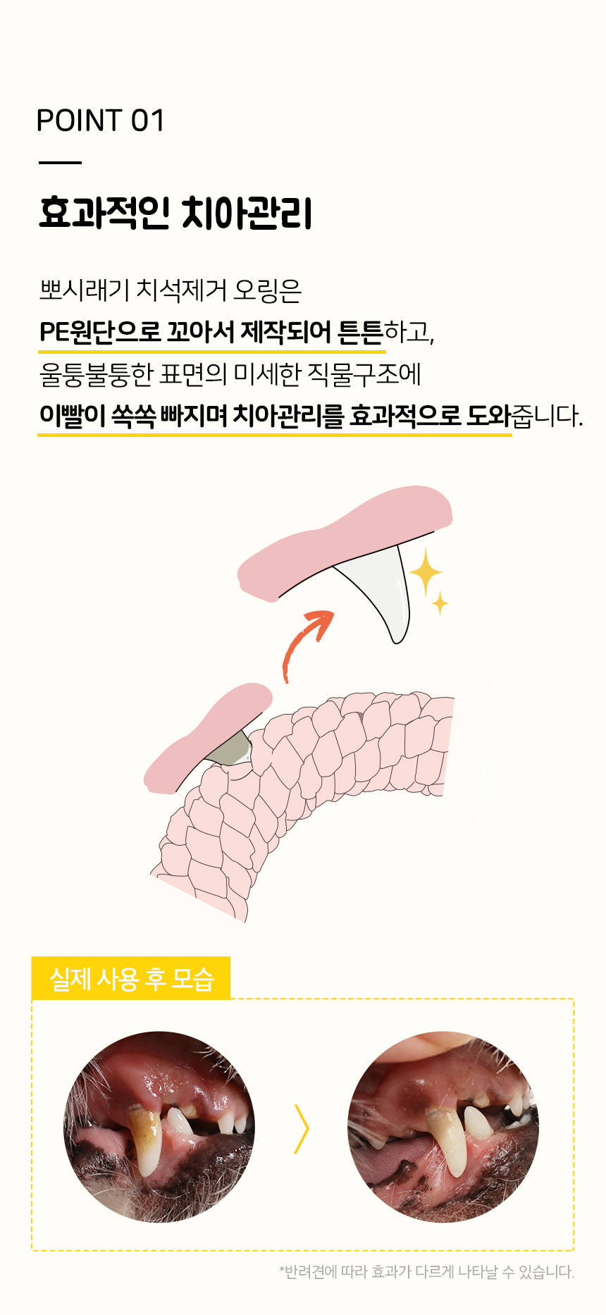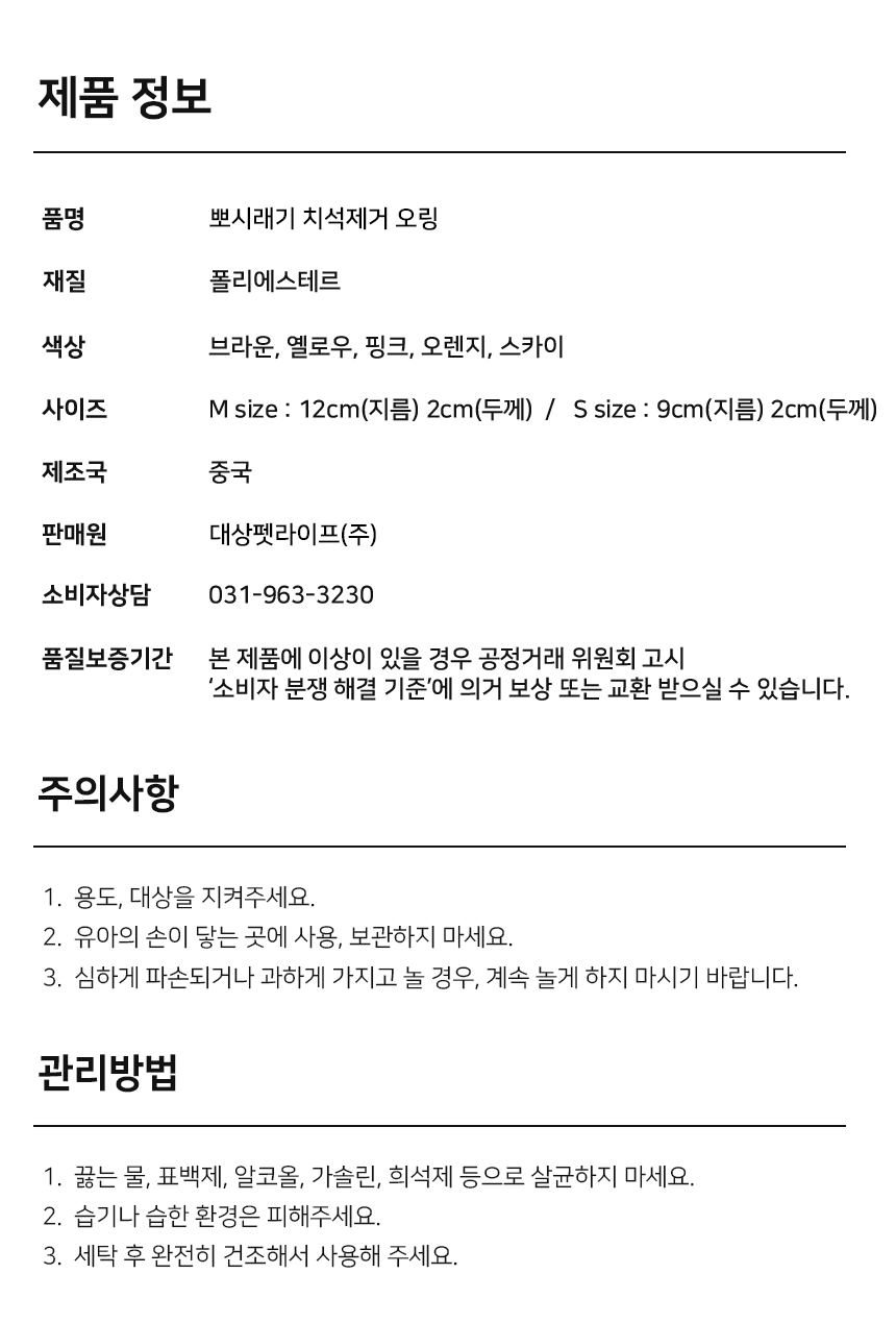 | 품명 및 모델명 | 뽀시래기 치석제거 오링 | 법에 의한 인증 · 허가 등을 받았음을 확인할 수 있는 경우 그에 대한 사항 | 상세페이지 참조 |